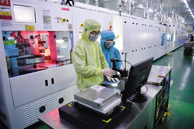 3月25日,工作人员在隆基单晶硅太阳能电池工厂内检查电池片。今年以来,在确保疫情防控安全的前提下,作为光伏行业龙头企业的隆基绿能科技股份有限公司,通过加大研发投入、提高智能化生产水平、加强供应链保障等手段,确保产能稳定。截至目前,该公司位于西安的单晶硅太阳能电池工厂今年已生产光伏组件核心部件——电池片近4亿片,超额完成一季度生产计划。 新华社记者 邵瑞摄