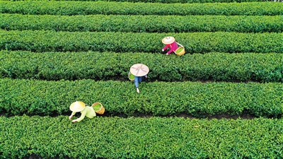 3月27日,在湖南省衡阳市常宁市塔山瑶族乡塔山村,茶农在采摘明前茶(无人机照片)。