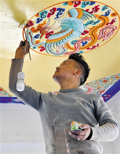 3月28日是西藏百万农奴解放纪念日。在西藏自治区日喀则市南木林县卡孜乡湘河水库移民新村,129户、685人庆祝喜迁新居。图为来自日喀则的民间艺人在湘河水库移民新村一处民居绘制屋顶(3月27日摄)。 新华社记者 张汝锋摄