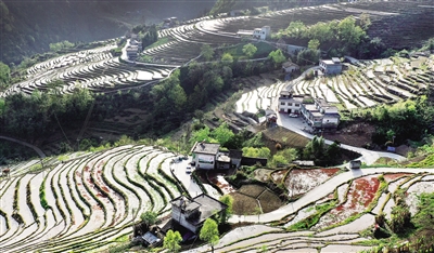 近日,在陕西省安康市岚皋县南宫山镇桂花村,因春灌备耕,沿山势自上而下层层铺叠的千亩梯田,仿佛戴上了一串串银链,构成了一幅优美的田园风光图。 新华社记者 陶明摄
