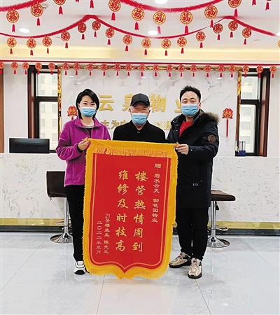 3月25日一大早,一位年过七旬的业主来到碧水云天·御花园物业前台,把一面写着“楼管热情周到 维修及时技高”的大红锦旗送给物业,以表达自己的感谢之情。