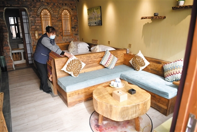 延安市宝塔区河庄坪镇赵家岸村一家民宿的服务员在整理房间(3月30日摄)。陕西延安市自2019年告别绝对贫困以来,坚持培育农村特色产业,融合发展一二三产,持续巩固脱贫成效。在稳定粮食生产基础上,延安市因地制宜做大做强以设施农业、畜牧业和苹果为主体的种养殖产业体系,并综合发展乡村旅游、社区工厂、农业企业促进农民就业,为群众增收不断拓宽渠道,为有效衔接乡村振兴提供产业支撑。 新华社记者 邵瑞摄