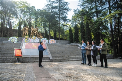 4月2日,在石壕红军烈士墓,赵福乾(左一)在培训年轻讲解员。