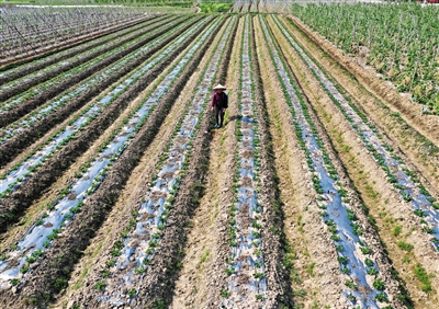 随着气温回升,广西南宁市兴宁区五塘镇村民忙着春耕春管,田园里生机勃勃,一派春色宜人的景象。图为4月6日,村民在广西南宁市兴宁区五塘镇的田间管护作物(无人机照片)。