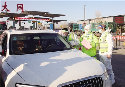 连日来,我市强化高速公路出入口疫情防控排查,值守人员相互配合、有序排查,确保“不漏一车,不漏一人”,全力以赴守牢疫情防控“大门”。图为4月6日,清明假期后上班第一天,大同东高速出口的防疫工作人员对出收费站的车辆司乘逐一测温、验码等检查。 本报记者 韩堃摄