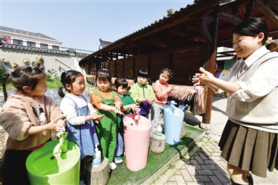 4月7日,浙江省建德市航头中心幼儿园的老师向小朋友讲解七步洗手法。