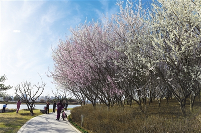 近日,随着气温升高,我市各公园的山桃花竞相开放,市民们纷纷走出家门享受好春光。图为昨日在文瀛湖生态公园,一片盛开的山桃花吸引了游园市民前来观赏。 本报记者 张占兵摄
