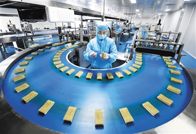 4月7日,山东省枣庄市山亭区一家企业员工在食品生产线上忙碌。