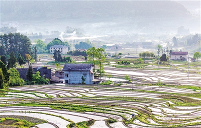 清明过后,雨水天气增多,重庆市南川区石溪镇盐井村村民抢抓时节耕地整田,为水稻栽插做好准备。蓄水肥田后的梯田波光粼粼,犹如一幅山水画卷,美不胜收。 新华社发(瞿明斌摄)