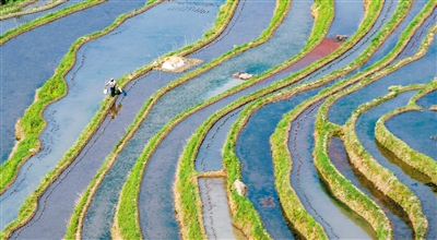 阳春三月,各地农民抢抓农时开展农业生产,田间地头一派繁忙景象。图为4月11日,村民在贵州省从江县加榜乡平引村梯田劳作。
