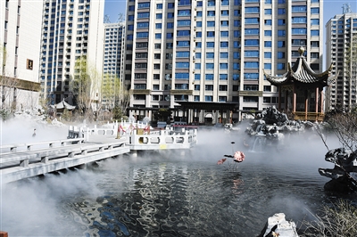 在碧水云天·御花园、新尊府、博雅府等碧水云天小区记者看到,小区大面积的湖景,随处可见的涌泉,与假山叠水一同营造出微波荡漾、流水潺潺、喷泉飞溅的清凉水世界,配以蜿蜒曲折的游廊、水榭、假山、六角亭、亲水平台以及汉白玉拱桥等。小区新中式江南园林的柔美,在潺潺流水中形成独具特色的中式园林景观,加上冷雾效果,小区水系景观感觉仿佛人间仙境一般。 冬梅 摄