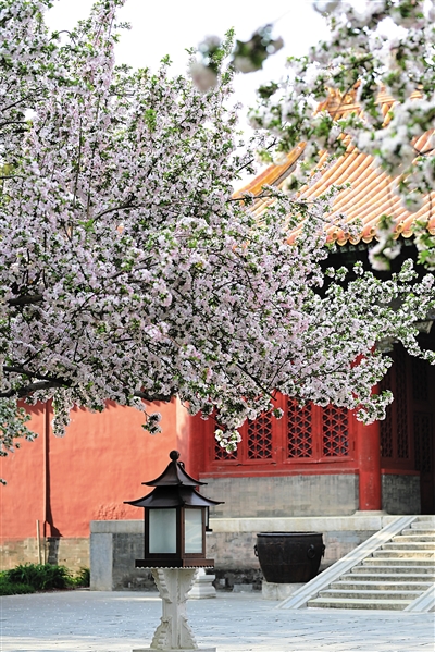 近日,北京故宫博物院内的海棠花竞相绽放,芳香四溢。图为4月13日在北京故宫博物院拍摄的海棠花。