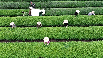 目前,福建省武夷山正值采茶制茶季。图为4月15日,茶农在武夷山市星村镇的茶山上采摘新茶(无人机照片)。