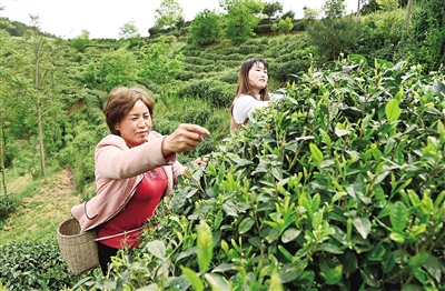 4月18日,余家沟村村民在高山茶园采茶。该村建有茶园1200亩。
