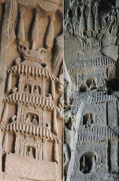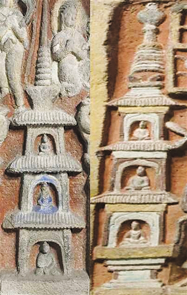为了便于研究,我们把在壁面上雕刻的浅浮雕楼阁塔定为A型,将明显突出墙体的高浮雕楼阁塔定为B型,雕刻出立体形状的且体型大的楼阁式佛塔即中心塔柱定为C型。