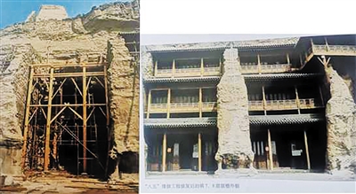 在传统工程方面,解金昌负责完成第3窟窟外后立壁蚀空带治理,对其用水泥砂浆垒砌荒料石填补支护。后立壁从东到西约长达50多延长米,含有九个竖井式的梁架孔,竖井深约20米,边长为1.5米,近似方形建筑遗迹。为防止游人从山顶裸露的方孔掉下来,解金昌让工人制作钢筋混凝土井盖,将9个建筑遗迹深井盖实(此混凝土井盖已约40年,建议检查、更换)。