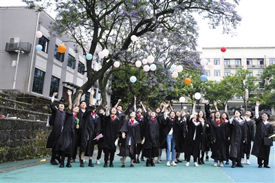 近日,位于重庆市北碚区的西南大学校园内的蓝花楹相继开花,毕业班的学生纷纷来此拍摄个性毕业照,留下校园美好回忆。图为5月16日,西南大学学生在盛开的蓝花楹下拍摄毕业照。