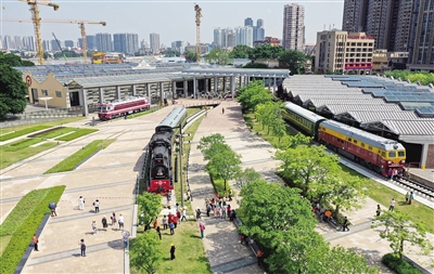 5月18日拍摄的广州铁路博物馆露天展区(无人机照片)。当日,广州铁路博物馆正式对外开放。博物馆在百年老站黄沙站的原址上修建,保留了铁路车站老建筑的基本风貌。