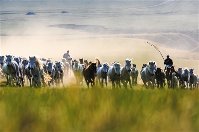 初夏时节,内蒙古锡林郭勒盟西乌珠穆沁旗的草原开始返青。当地牧民赶着马匹,来到草原上驯马,景象壮观。图为,5月17日,牧民在锡林郭勒盟西乌珠穆沁旗草原上套马。