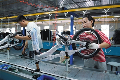 5月22日,河北省平乡县一家童车生产企业的工人在组装童车。