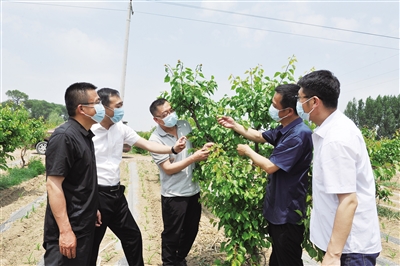 5月24日,云冈区谢店村驻村工作队队员在该村大接杏经济林开展调查。