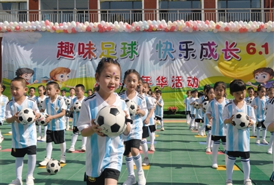 5月27日,市教育局直属幼儿园里热闹非凡,以“趣味足球 快乐成长”为主题的庆“六一”足球嘉年华活动在幼儿园操场进行,孩子们和老师欢聚一堂,一起在游戏中体验趣味足球活动带来的快乐。 本报记者 戎禹仁 摄