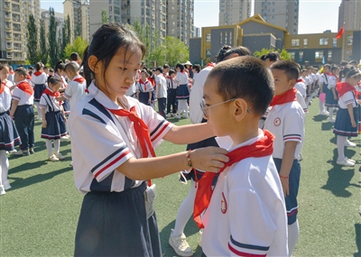 在入队仪式上,高年级队员为一年级新队员戴上了鲜艳的红领巾,并领着他们在队旗下庄严宣誓。新队员们纷纷表示,会在星星火炬的指引下,永远听党话,时刻跟党走,争做新时代少先队员。