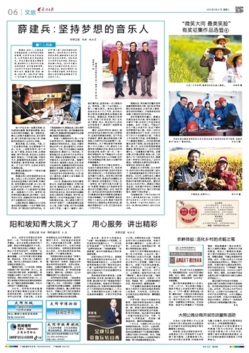 薛建兵的艺术才情也受到另一位音乐大家张枚同的认可。张枚同是我国著名的词作家,他的《年轻的朋友来相会》《二十年后再相会》等作品风靡大江南北。张枚同以前对薛建兵并不熟识,是通过作品编配认识和了解他的,他很喜欢这个年轻人的一些想法,有了新作总是不忘请“兵兵”先看看,薛建兵也大胆地向老师提出自己的建议想法。近年,张枚同的一些作品如《种花姑娘》《四牌楼》《古都夏夜的微笑》等都是由薛建兵作曲并做编配。“云中两棵树”是张枚同的个人音乐公众号,集纳了张枚同和他的夫人程琪的众多原创作品,薛建兵很喜欢这个公号,它已成为他的一大学习平台。
