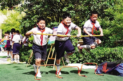 5月31日,在济南市槐荫区恒新小学,同学们参加“奋勇跨越向未来”游戏。