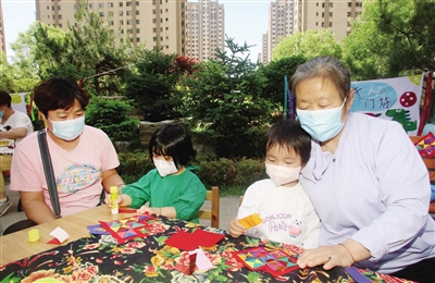 为了让孩子们过一个丰富多彩、喜庆快乐的儿童节,6月1日,平城区新旺街道御河九号社区联合一家幼儿园开展了“迎端午 庆六一”亲子活动,在活动中传承中华优秀传统文化。图为家长和孩子们正在制作端午门符。 本报记者 韩堃摄