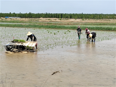 桑干河畔鱼米乡,不误农时插秧忙。连日来,在云州区吉家庄乡南息村兴禾稻蟹农场的稻田里,农民们正在进行水稻插秧,构成了一幅流动的田园画卷。