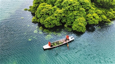 世界环境日前夕,各地通过多种活动唤起人们珍惜资源、爱护环境的意识。图为6月4日,志愿者在湖南省常宁市洋泉水库清理水面漂浮物(无人机照片)。