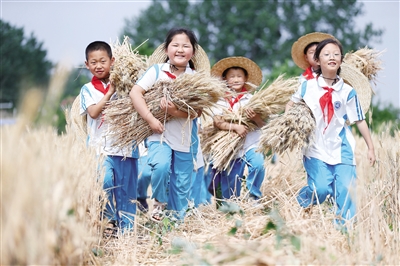 麦收时节,山东省青岛市即墨蓝谷高新区东皋埠小学学生们种植的小麦迎来丰收。孩子们在老师的指导下,收割小麦、捡拾麦穗、脱粒晾晒,在忙碌中感受劳动的艰辛和丰收的快乐。