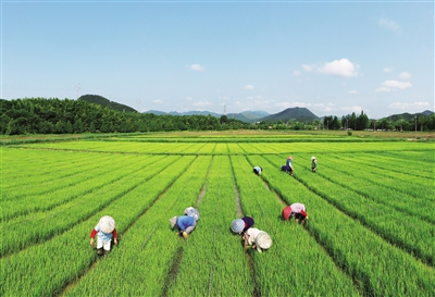 6月21日,农户在浙江省湖州市吴兴区埭溪镇山背村璞心农场进行田间管护(无人机照片)。夏至时节,各地农民抢抓农时进行田间作业。 新华社发(何伟卫摄)