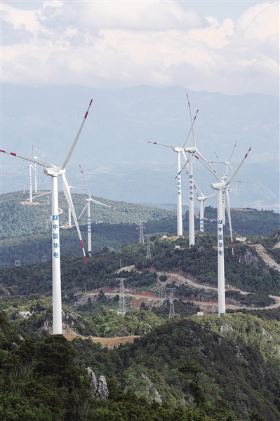 这是位于四川盐源县棉桠镇的四川盐源华电新能源有限公司的凉风坳风电场一角(6月20日摄)。四川省盐源县地处青藏高原东南缘,境内多高山峡谷。近年来,盐源县加快发展风光互补清洁能源产业,打造县域经济发展“绿色引擎”。目前,全县风力、太阳能发电项目装机达80万千瓦。 新华社记者 江宏景摄