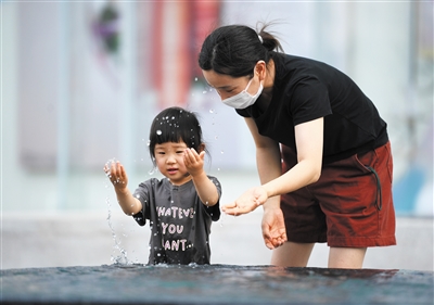 6月21日,家长带着小朋友在郑州市金水区花园路一处景观水池玩水。