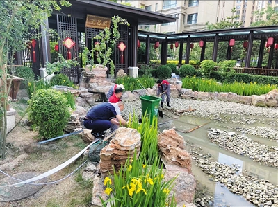 御河十号小区大小景观池6个,有些景观池长达数十米,给日常清理维护增加了不小的难度,需要登高爬低清擦水垢留痕,一点点擦洗沉淀的泥沙青苔。