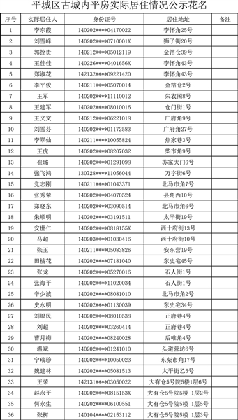 在《大同市人民政府关于古城内棚户区改造及环境综合整治房屋征收的通告》范围内,有部分平房因时间跨度较长、人员居住更替等原因,对实际居住人情况无法进行有效落实,为了合理办理房屋征收安置手续,现将该部分房屋居民提供的实际居住信息进行公示,若对公示房屋情况存在异议者,可在本公告登报后7个工作日内持相关佐证向大同市平城区古城街道办事处提出书面异议。若公告期满无异议的,将按照相关政策办理房屋安置补偿手续。