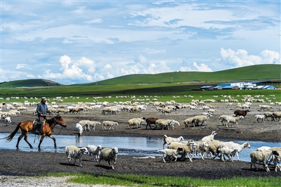 6月26日,牧民在新巴尔虎左旗道乐都夏营地放牧。