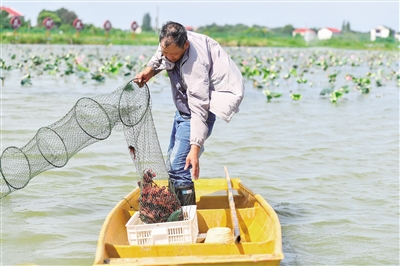 6月27日,在长沙市望城区乔口镇,虾农在荷花田里捕捞小龙虾。