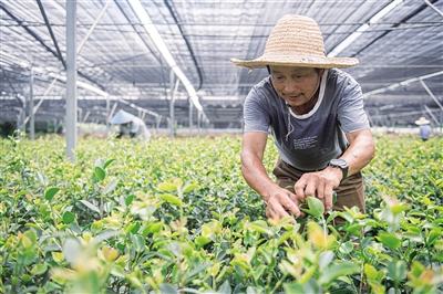 7月5日,农户在常山油茶良种繁育基地大棚内查看油茶种苗生长情况。