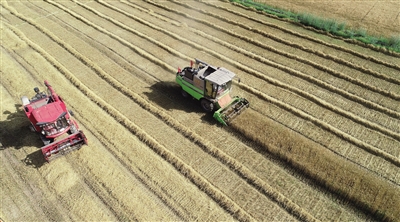 7月7日,平罗县姚伏镇小店子村,联合收割机在麦田里作业(无人机照片)。