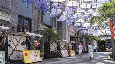 7月11日,在重庆市南岸区弹子石老街,市民在具有遮阳功能的景观伞下行走。