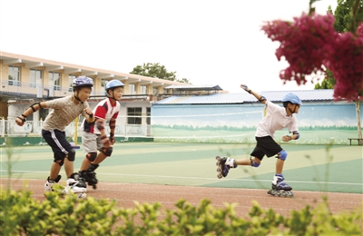 7月12日,在河北省邢台市南康庄小学,参加暑期活动的孩子们练习轮滑。