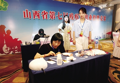 7月13日,由山西省残疾人联合会与山西省人力资源和社会保障厅共同主办,山西省残疾人就业服务指导中心承办,大同市残疾人服务指导中心协办的山西省第七届残疾人职业技能竞赛大同分赛场比赛在我市举行。来自全省11个市的20名优秀残疾人选手参加了棒针编织、美甲两个项目的竞赛。图为美甲比赛现场,参赛选手正在制作参赛作品。 本报记者 韩堃摄
