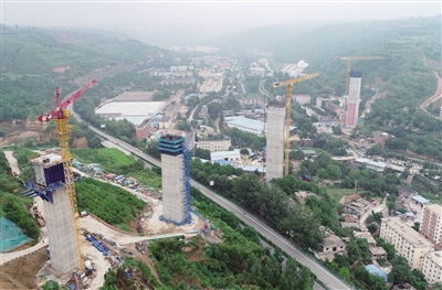 这是7月15日拍摄的西延高铁王家河特大桥施工现场(无人机照片)。当日,由中国铁建大桥工程局承建的西(安)延(安)高铁王家河特大桥主墩顺利封顶。王家河特大桥位于陕西省铜川市王益区境内,全长1066米,为西延高铁全线重点控制性工程。西延高铁是国家高速铁路网包(银)海高速铁路通道的重要组成部分。线路建成投入运营后,西安至延安的运行时间将从目前的2个半小时缩短至1小时左右。 新华社记者 张博文摄