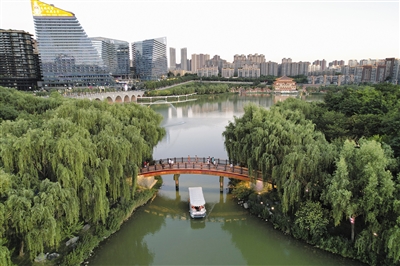 西安曲江池遗址公园一景(2022年6月14日摄,无人机照片)。