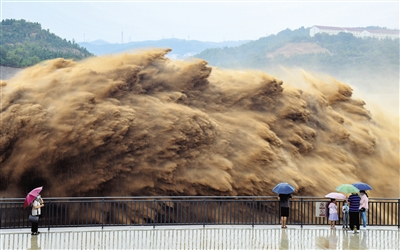 7月19日,游客观看黄河小浪底水库大流量泄洪。