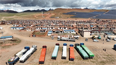 在双湖县多玛乡仲鲁玛村,运输家具的货车整装待发(7月13日摄,无人机照片)。
