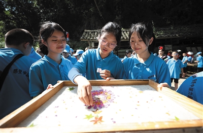 7月25日,小学生在贵州省黔东南苗族侗族自治州丹寨县南皋乡石桥村造纸作坊体验花草纸制作技艺。
